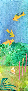 This was my first attempt at doing one of Karen Knutson's "wire drawings". See her work at www.karenknutson.com. It's supposed to be a combination drawing, zentangle, with added collage and paint. Well, I got the collage and paint part OK but I didn't like the busy background (permanent ink) behind the bird. I tried to tone it down with gouache, then naples yellow, finally I used white acrylic. See the next picture. I also modified the background colors.